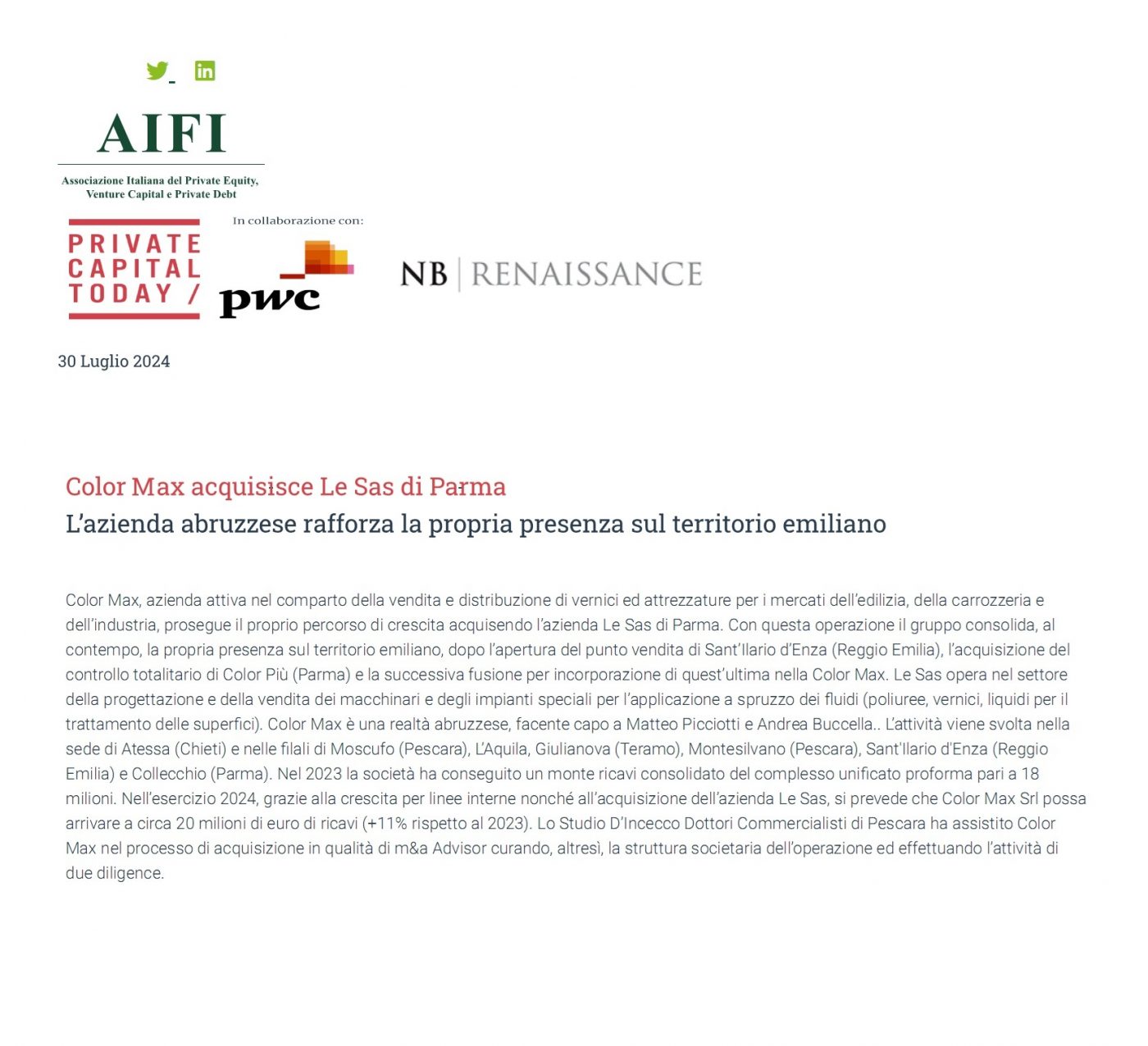Color Max acquisisce Le Sas di Parma. L’azienda abruzzese rafforza la propria presenza sul territorio emiliano