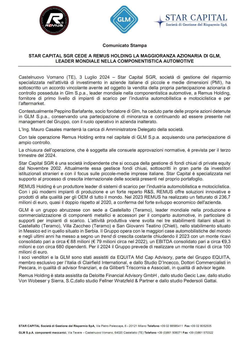 STAR CAPITAL SGR CEDE A REMUS HOLDING LA MAGGIORANZA AZIONARIA DI GLM, LEADER MONDIALE NELLA COMPONENTISTICA AUTOMOTIVE